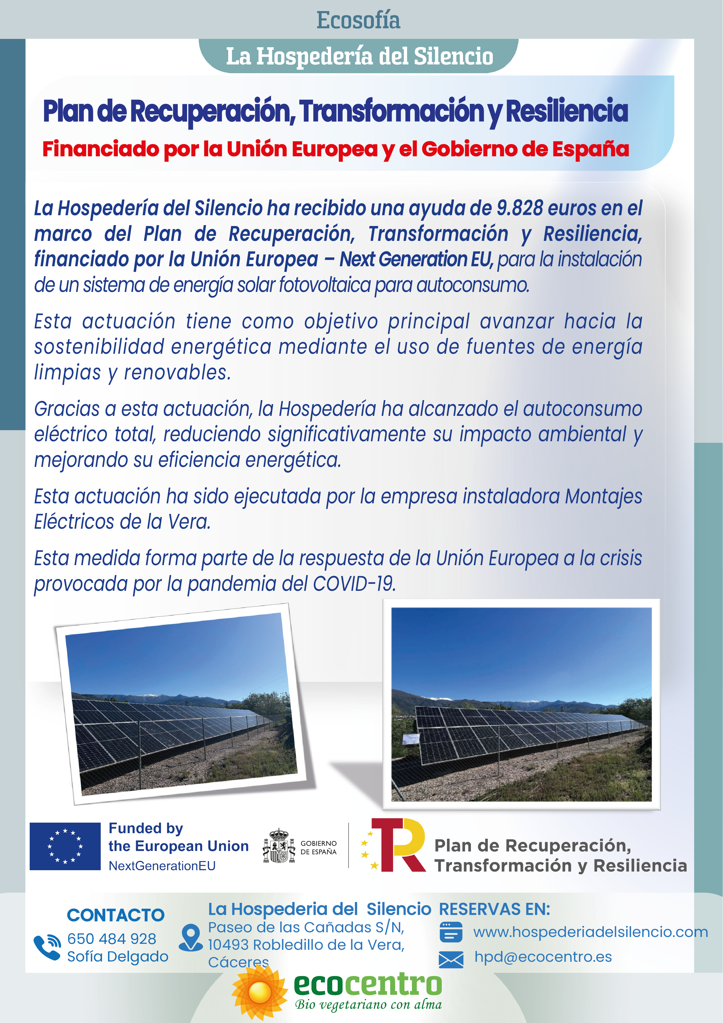 La Hospedería del Silencio ha recibido una ayuda de 9.828 euros en el marco del Plan de Recuperación, Transformación y Resiliencia, financiado por la Unión Europea – Next Generation EU, para la instalación de un sistema de energía solar fotovoltaica para autoconsumo.